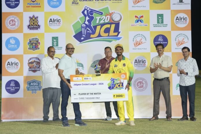 जळगाव क्रिकेट लीग २०२६ चा बहुप्रतिक्षित ग्रॅण्ड फायनल सामना आज रविवारी सायंकाळी ६ वाजता जैन ड्रीम स्पेसेसच्या मैदानावर रंगणार असून अमळनेर सुहांस जायंटस आणि जळगाव कोगटा किंग्ज या दोन दमदार संघांमध्ये विजेतेपदासाठी अटीतटीची लढत होणार आहे. संपूर्ण स्पर्धेत सातत्यपूर्ण आणि प्रभावी कामगिरी करत अंतिम फेरी गाठलेल्या दोन्ही संघांमुळे क्रिकेटप्रेमींमध्ये प्रचंड उत्सुकता निर्माण झाली आहे. विजेतेपदाची ट्रॉफी कोणाच्या नावावर जाणार, याकडे संपूर्ण जिल्ह्याचे लक्ष लागले आहे.