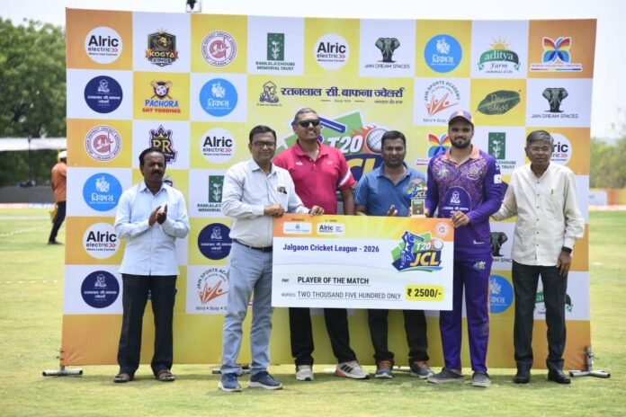 जळगाव जिल्हा क्रिकेट असोसिएशनतर्फे रतनलाल सी. बाफना ज्वेलर्स यांच्या प्रायोजकत्वाखाली आणि अलरीक इलेक्ट्रीकल्सच्या सहप्रायोजकत्वातून सुरू असलेल्या जळगाव क्रिकेट लिग-२०२६ (JCL T-20) स्पर्धेत उपांत्यफेरी गाठण्यासाठी संघांमध्ये तीव्र स्पर्धा निर्माण झाली आहे. बुधवारी झालेल्या सामन्यांमध्ये रावेर रॉयल्स, अमळनेर सुहांस जायंट्स आणि चाळीसगाव एसपीसीसी चॅलेंजर या संघांनी विजय मिळवत स्पर्धेत आपले स्थान बळकट केले. सकाळच्या सामन्यात रावेर रॉयल्सने पाचोरा एसकेटी योद्धाजवर सात धावांनी मात करत स्पर्धेतील पहिला विजय नोंदवला, तर दुसऱ्या सामन्यात अमळनेर सुहांस जायंट्सने चाळीसगाव एसपीसीसी चॅलेंजरवर ६३ धावांनी दणदणीत विजय मिळवला.