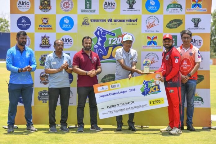 जळगाव जिल्हा क्रिकेट असोसिएशनच्या वतीने रतनलाल सी. बाफना ज्वेलर्स यांच्या प्रायोजकत्वाखाली व अलरीक इलेक्ट्रीकल्स यांच्या सहप्रायोजकत्वातून आयोजित जळगाव क्रिकेट लीग (JCL) टी-२० स्पर्धेला कांताईनगर येथील जैन ड्रीम स्पेसेस मैदानावर चांगलाच प्रतिसाद मिळत असून सोमवारी झालेल्या सामन्यांमध्ये पाचोरा एसकेटी योद्धाज आणि चाळीसगाव एसपीसीसी चॅलेंजर यांनी विजय मिळवला, तर रविवारी रात्रीच्या लढतीत जामनेर सातपुडा हिरोज संघाने दमदार कामगिरी करत विजयाची नोंद केली. जिल्ह्यातील विविध भागांतील संघांचा सहभाग, खेळाडूंची स्पर्धात्मक कामगिरी आणि प्रेक्षकांचा उत्स्फूर्त प्रतिसाद यामुळे स्पर्धेचा रोमांच वाढत आहे.